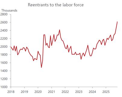 While the decent increase in private payrolls added a positive hue to the jobs report, the headlines featured its most glaring weakness – an increase in the unemployment rate to 4.6 percent, marking the highest level since 2021. Simply put, the increase in job seekers exceeded the increase in people finding jobs. For a labor force that has been squeezed by the immigration crackdown, deportations and retirements, the question is: Where are these job searches coming from? One answer is that people are reentering the labor force in droves. In November the number of reentrants to the labor force jumped to the highest level in more than a decade, extending a trend underway since the summer.