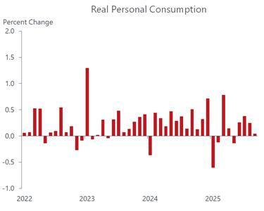 The weaker exit to the third quarter reflected a pullback by consumers, the economy’s main growth driver. That was documented last week with the soft retail sales data for September and confirmed this Friday with the more comprehensive data on personal income and consumption. Total outlays on goods and services rose by 0.3 percent during the month, but the gain was all price-related, as real spending came in flat, following two months of solid increases which imparted a solid gain for the period. But in a clear sign of waning momentum, the September level of real spending stood only 2.1 percent higher than a year earlier, down from 2.6 percent in August and the weakest annual gain since January 2024.