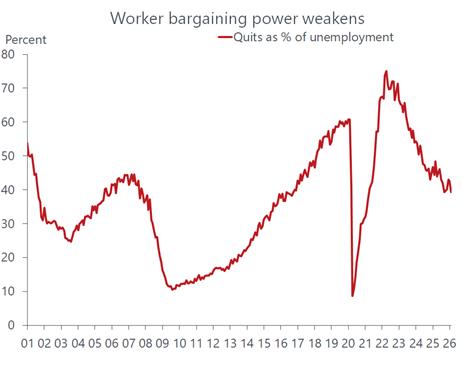 The good news for the macro economy is that the recent trend in earnings confirms that wages will not be a source of higher inflation. Nor should worker bargaining power strengthen anytime soon. The most visible evidence of that is the reluctance of workers to quit their jobs, believing that a better paying one could readily be found. The overall voluntary quit rate matches the lowest of the expansion. And except for the Covid plunge, the ratio of quits to unemployed workers is the lowest in more than 10 years. As much as anything, that highlights the profound shift in bargaining power from workers to employers that has taken place since the spring of 2025, when workers briefly flexed their bargaining muscle.