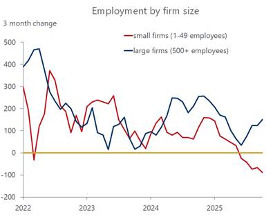 That bifurcation is not just confined to the household space, but in the business sector as well. We note that publicly traded corporations are delivering strong earnings results, propping up stock prices, but proprietors’ income, a component in the personal income report, fell again in September, the third setback in the past five months. One sign that mom-and-pop establishments are struggling is seen in their handling of their workforces. According to the latest ADP report, small businesses – those with less than 50 workers – continue to downsize, lopping off another 10 thousand employees in October, bringing total layoffs to 88 thousand over the last three months. Large firms, those with more than 500 workers on the books, added 151 thousand workers to their payrolls.
