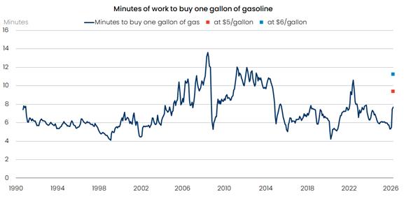 That means jobholders have to work longer just to fill up Old Betsy. At the latest nationwide average retail price of gasoline -- $4.23 a gallon as of mid-April – nonmanagement employees are devoting 7.7 working minutes towards the cost of a service station visit, based on average earnings in March. That’s well above the time worked during the 1990s but exceeded several times over the past twenty years. However, should tensions flare up again and undercut the tenuous ceasefire, reigniting the oil price climb, things would get dicey. At $5 a gallon – which was widely considered approachable before Friday’s news – the gas-time spent on the job would rise to 9.34 minutes. At $6/gallon, more than 11 minutes would be needed, which exceeds the peak reached following Russia’s invasion of Ukraine in 2022. Importantly, a robust job market and strong worker bargaining power enabled the economy to weather that headwind. That’s not the case now.