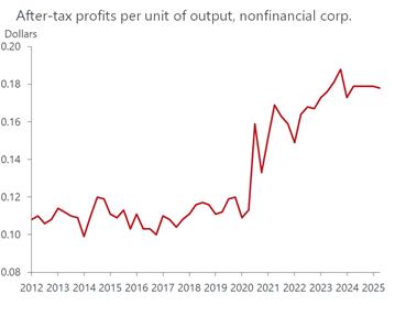 The one blemish on the GDP report is that the revisions cut a full percentage point from the income side of the ledger, reducing the increase in gross domestic income to 3.8 percent in the second quarter. However, the haircut was not taken from households but from corporations, where an outsized $58.7 billion was sliced from profits. That still left margins well above their historical average, but there has been no improvement over the past four quarters. Margins actually narrowed a bit in the second quarter for nonfinancial corporations and slipped considerably from their peak in the fourth quarter of 2022, when the post-pandemic inflation surge drove revenues up much faster than costs. That confluence reversed with the subsequent disinflation cycle, and the second quarter mild compression may reflect an early hit to costs from tariffs.